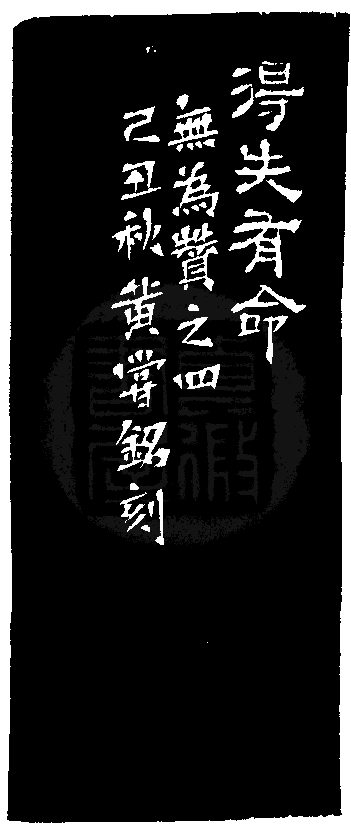 黃嘗銘.五十六歲/刻〔得失有命〕正方細朱文印。邊款為【得失有命,無為贊之四。己丑秋,黃嘗銘刻。】巴林石。平頂。