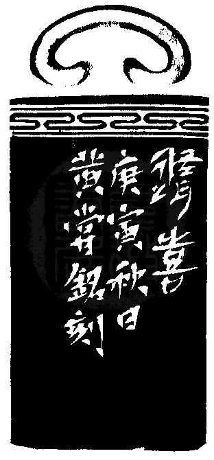 黃嘗銘.五十七歲/刻〔隨喜〕長方細朱文印。邊款為【隨喜。庚寅秋日,黃嘗銘刻。】江西石。瓦鈕。