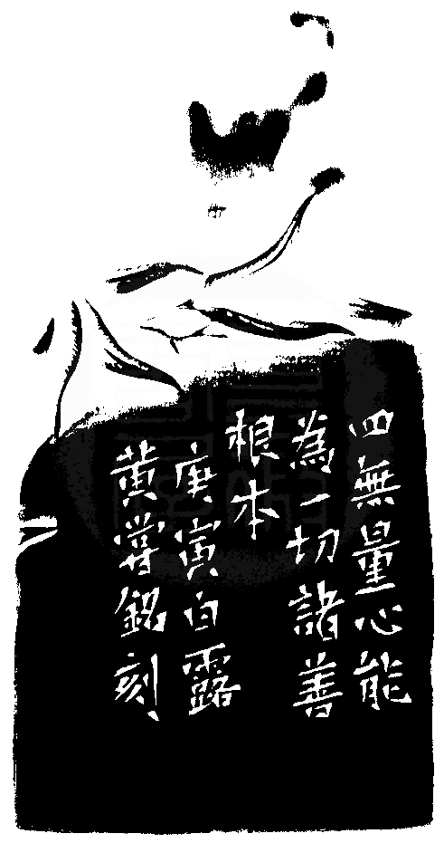 黃嘗銘.五十七歲/刻〔慈悲喜捨〕長方細朱文印。邊款為【四無量心能為一切諸善根本。庚寅白露,黃嘗銘刻。】芙蓉石。佛手瓜鈕。