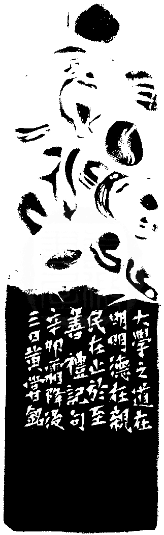 黃嘗銘.五十八歲/刻〔止于至善〕正方朱文印。邊款為【大學之道在明明德,在親民,在止於至善,禮記句。辛卯霜降後三日,黃嘗銘。】芙蓉石。