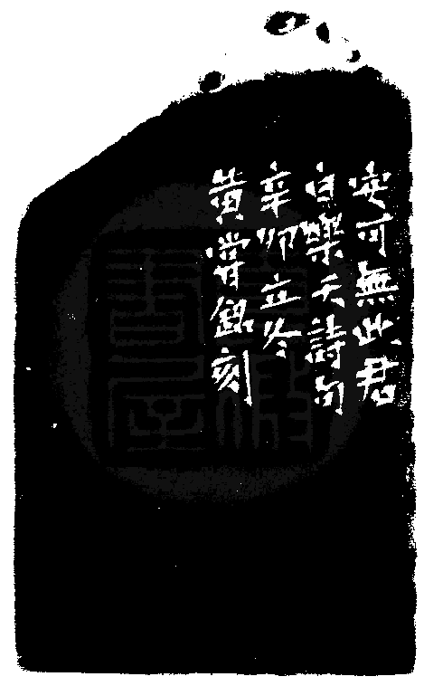 黃嘗銘.五十八歲/刻〔安可無此君〕長方朱文印。邊款為【安可無此君。白樂天詩句。辛卯立冬,黃嘗銘刻。】壽山高山石。巧色龜鈕。