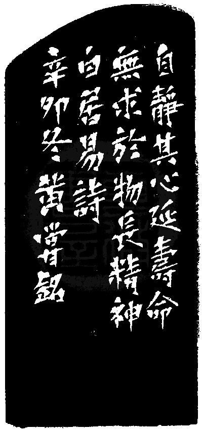 黃嘗銘.五十八歲/刻〔自靜其心延壽命〕正方白文印。邊款為【自靜其心延壽命,無求於物長精神。白居易詩。辛卯冬,黃嘗銘。】巴林石。薄意。