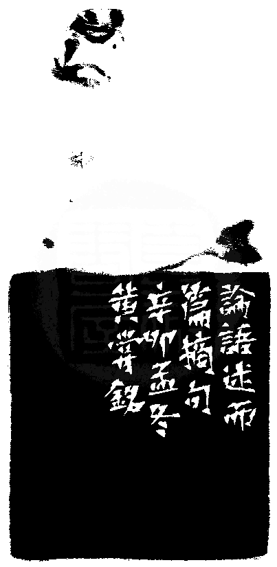 黃嘗銘.五十八歲/刻〔三人行必有我師〕長方朱文印。邊款為【《論語.述而》篇摘句。辛卯孟冬,黃嘗銘。】芙蓉石。獅鈕。