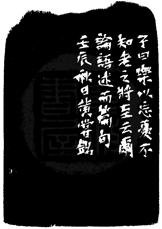 黃嘗銘.五十九歲/刻〔樂以忘憂〕長方朱文印。邊款為【子曰:樂以忘憂,不知老之將至云爾。《論語.述而》篇句。壬辰秋,黃嘗銘刻。】
