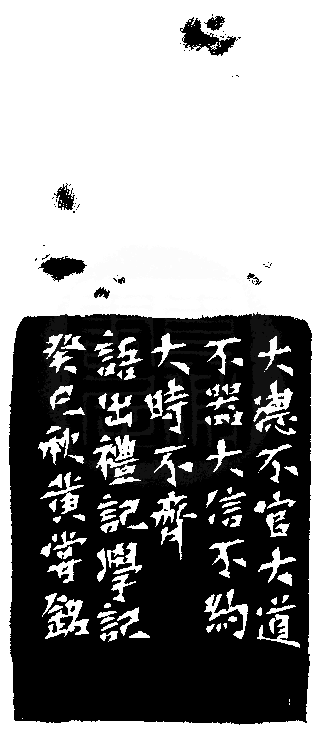 黃嘗銘.六十歲/刻〔大道不器〕正方朱文印。邊款為【大德不官,大道不器,大信不約,大時不齊。語出《禮記.學記》。癸巳秋,黃嘗銘。】