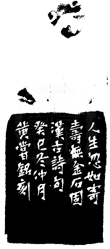 黃嘗銘.六十歲/刻〔金石永壽〕正方白文印。邊款為【人生忽如寄,壽無金石固。漢古詩句,癸巳冬仲月,黃嘗銘刻。】