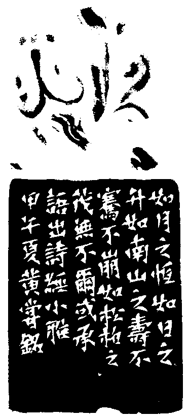 黃嘗銘.六十一歲/刻〔南山之壽〕正方朱文印。邊款為【如月之恆,如日之升,如南山之壽,不騫不崩,如松柏之茂,無不爾或承。語出詩經小雅。甲午夏,黃嘗銘。】芙蓉石。獸鈕。