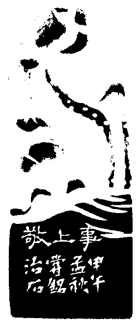 黃嘗銘.六十一歲/刻〔事上敬〕正方加框白文印。邊款為【事上敬。甲午孟秋,嘗銘治石。】芙蓉石。荷葉浮雕。
