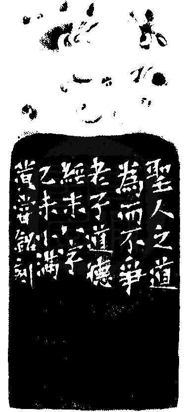 黃嘗銘.六十二歲/刻〔聖人之道為而不爭〕正方細朱文印。邊款為【聖人之道,為而不爭。老子《道德經》末八字。乙未小滿,黃嘗銘刻。】壽山山仔瀨石。雙獸鈕。