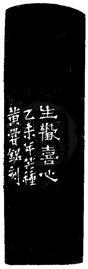 黃嘗銘.六十二歲/刻〔生歡喜心〕長方朱文印。邊款為【生歡喜心。乙未年芒種,黃嘗銘刻。】昌化雞血石。圓頂。