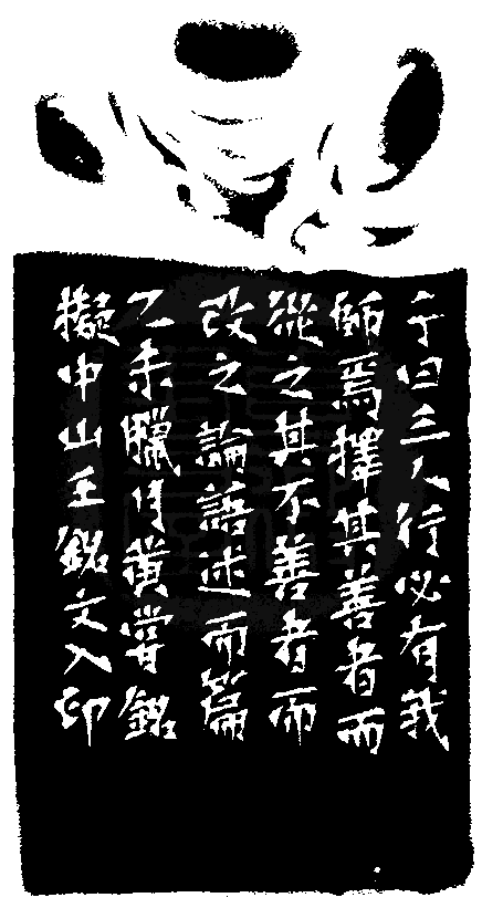 黃嘗銘.六十二歲/刻〔擇善而從〕正方朱文印。邊款為【子曰:三人行必有我師焉,擇其善者而從之,其不善者而改之。《論語.述而》篇。乙未臘月,黃嘗銘擬中山王銘文入印。】老撾石。獸鈕。