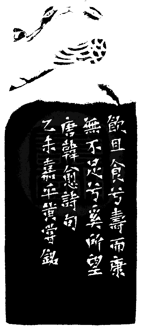 黃嘗銘.六十二歲/刻〔無不足兮奚所望〕正方朱文印。邊款為【飲且食兮壽而康,無不足兮奚所望。唐韓愈詩句。乙未嘉平,黃嘗銘。】老撾石。花鳥鈕。
