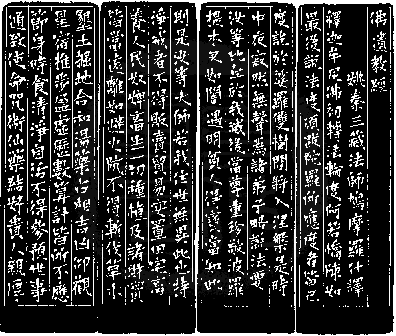 | | 印文:佛遺教經 | | 約 橫 2.8 X 豎 2.9 公分 印面圖 | | 黃嘗銘.六十二歲/刻〔佛遺教經〕正方朱文印。邊款為【佛遺教經。姚秦三藏法師鳩摩羅什譯。釋迦牟尼佛,初轉法輪,度阿若憍陳如;最後說法,度須跋陀羅。所應度者,皆已度訖。於娑羅雙樹間,將入涅槃。是時中夜,寂然無聲,為諸弟子略說法要。汝等比丘,於我滅後,當尊重珍敬波羅提木叉,如闇遇明,貧人得寶。當知此則是汝等大師,若我住世,無異此也。持淨戒者,不得販賣貿易,安置田宅,畜養人民、奴婢、畜生;一切種植及諸財寶,皆當遠離,如避火阬;不得斬伐草木,墾土掘地。合和湯藥,占相吉凶,仰觀星宿,推步盈虛,歷數算計,皆所不應。節身時食,清淨自活,不得參預世事、通致使命,咒術仙藥,結好貴人,親厚】巴林石。圓頂。 2015 年刻 |
