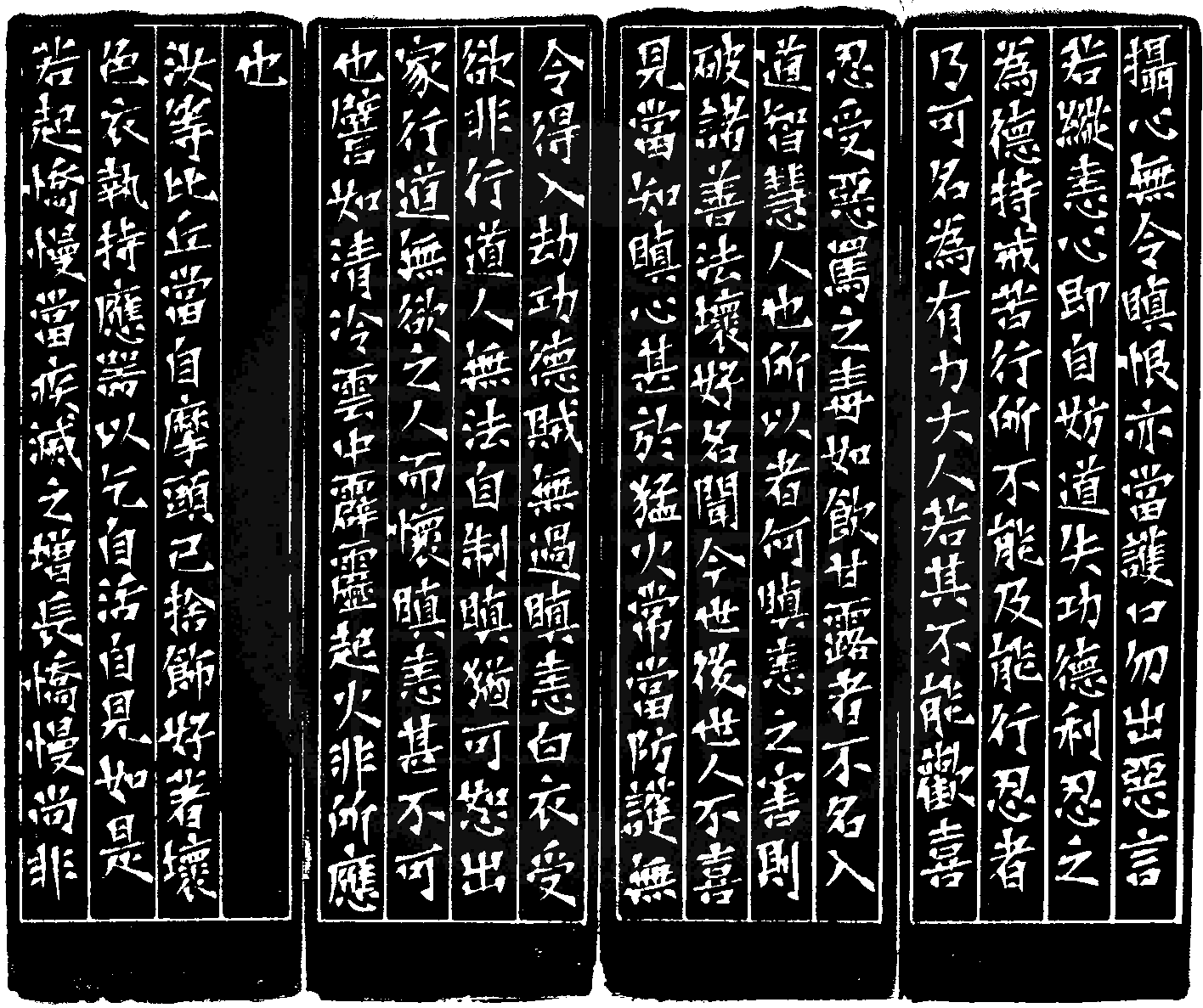 | | 印文:無懷瞋罣 | | 約 橫 2.8 X 豎 2.8 公分 印面圖 | | 黃嘗銘.六十二歲/刻〔無懷瞋罣〕正方白文印。邊款為【攝心,無令瞋恨;亦當護口,勿出惡言。若縱恚心,即自妨道,失功德利。忍之為德,持戒苦行所不能及。能行忍者,乃可名為有力大人。若其不能歡喜忍受惡罵之毒如飲甘露者,不名入道智慧人也。所以者何?瞋恚之害,則破諸善法,壞好名聞,今世後世,人不喜見。當知瞋心,甚於猛火,常當防護,無令得入。劫功德賊,無過瞋恚。白衣受欲,非行道人,無法自制,瞋猶可恕;出家行道,無欲之人,而懷瞋恚,甚不可也。譬如清冷雲中,霹靂起火,非所應也。汝等比丘,當自摩頭,已捨飾好,著壞色衣,執持應器,以乞自活,自見如是。若起憍慢,當疾滅之。增長憍慢,尚非】巴林石。圓頂。 2015 年刻 |
