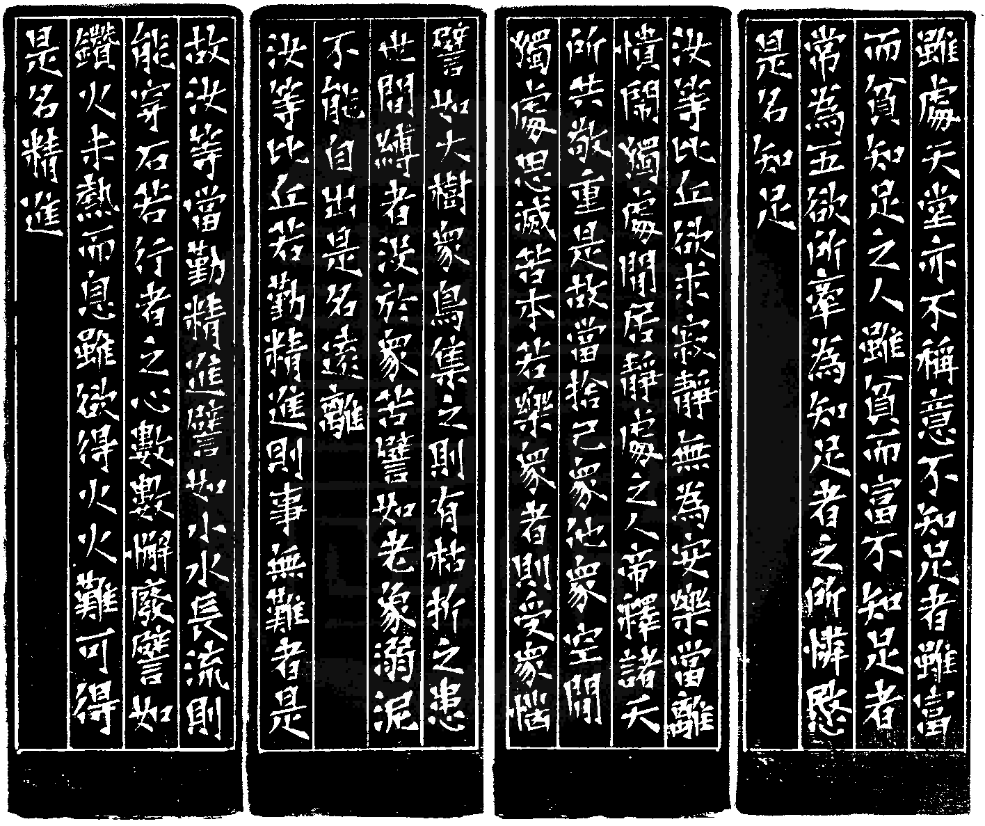 | | 印文:遠離精進 | | 約 橫 2.8 X 豎 2.9 公分 印面圖 | | 黃嘗銘.六十二歲/刻〔遠離精進〕正方白文縱格印。邊款為【雖處天堂,亦不稱意。不知足者,雖富而貧;知足之人,雖貧而富。不知足者,常為五欲所牽,為知足者之所憐愍。是名知足。汝等比丘,欲求寂靜無為安樂,當離憒鬧,獨處閒居。靜處之人,帝釋諸天所共敬重。是故當捨己眾他眾,空閒獨處,思滅苦本。若樂眾者,則受眾惱;譬如大樹,眾鳥集之,則有枯折之患。世間縛者,沒於眾苦,譬如老象溺泥,不能自出。是名遠離。汝等比丘,若勤精進,則事無難者,是故汝等當勤精進。譬如小水長流,則能穿石。若行者之心數數懈廢,譬如鑽火,未熱而息,雖欲得火,火難可得。是名精進。】巴林石。圓頂。 2015 年刻 |