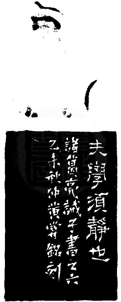 黃嘗銘.六十二歲/刻〔夫學須靜也〕正方白文印。邊款為【夫學須靜也。諸葛亮誡子書之六,乙未秋仲,黃嘗銘刻。】老撾石。