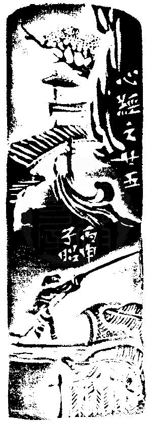 黃嘗銘.六十三歲/刻〔乃至無老死〕正方白文印。邊款為【心經之廿五。丙申,子昭。】昌化黃凍石。山水薄意。