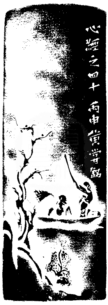 黃嘗銘.六十三歲/刻〔故知般若波羅蜜多〕正方細朱文印。邊款為【心經之四十。丙申,黃嘗銘。】昌化黃凍石。山水薄意。