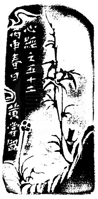 黃嘗銘.六十三歲/刻〔菩提薩婆訶〕正方朱文印。邊款為【心經之五十二。丙申春日,黃嘗銘。】昌化黃凍石。山水薄意。