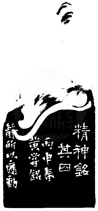黃嘗銘.六十三歲/刻〔靜所以應動〕正方朱文印。邊款為【靜所以應動。精神銘其四。丙申春,黃嘗銘。】老撾石。獸鈕。