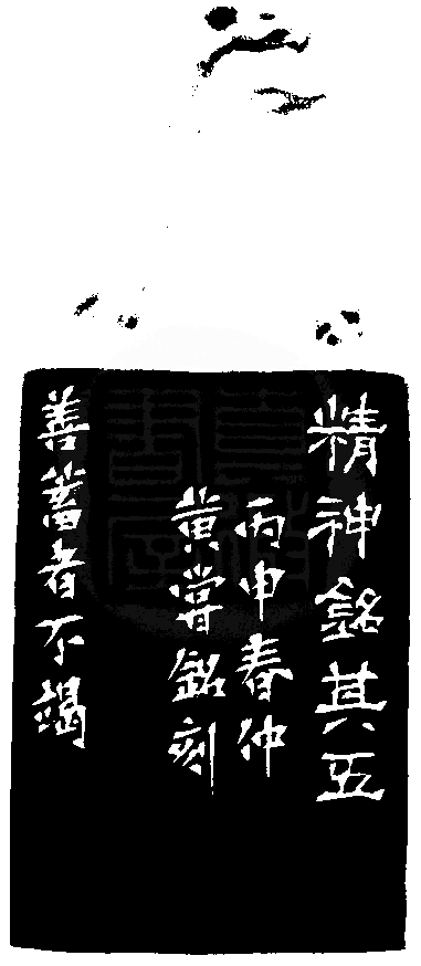 黃嘗銘.六十三歲/刻〔善蓄者不竭〕正方白文印。邊款為【善蓄者不竭。精神銘其五。丙申春仲,黃嘗銘刻。】老撾石。獸鈕。