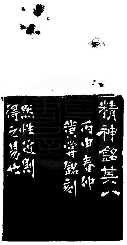 黃嘗銘.六十三歲/刻〔然性近則得之易也〕長方細朱文印。邊款為【然性近則得之易也。精神銘其八。丙申春仲,黃嘗銘刻。】老撾石。獸鈕。