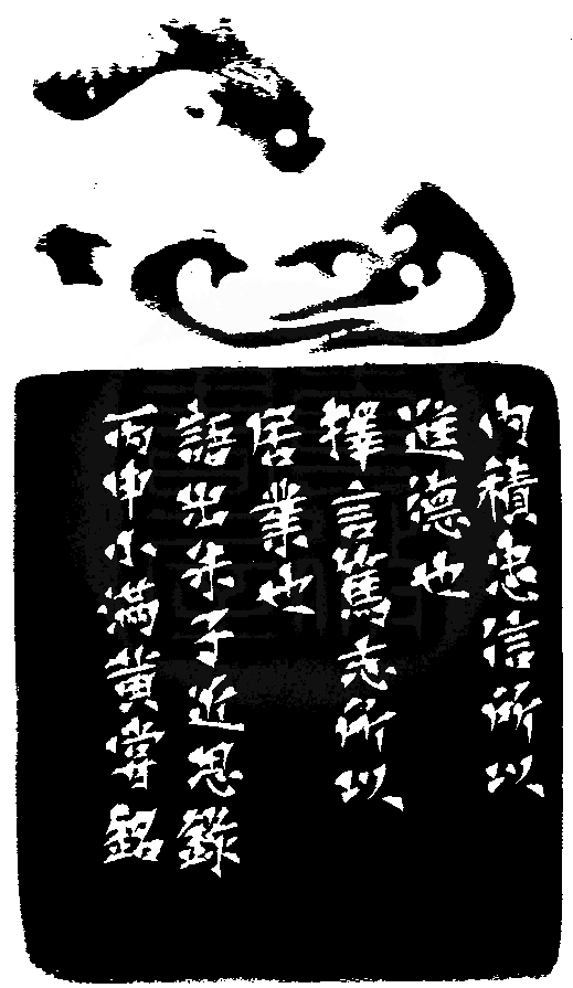 黃嘗銘.六十三歲/刻〔內積忠信擇言篤志〕正方朱文印。邊款為【內積忠信所以進德也,擇言篤志所以居業也,語出朱子《進思錄》。丙申小滿,黃嘗銘。】老撾石。牛鈕。
