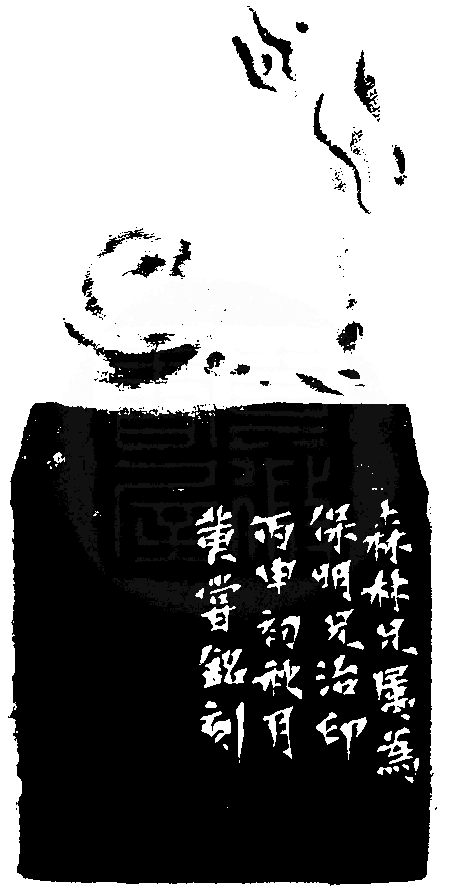 黃嘗銘.六十三歲/刻〔山風送涼忙裡偷閒〕正方朱文印。邊款為【森林兄屬為保明兄治印。丙申初秋月,黃嘗銘刻。】芙蓉石。獸鈕。