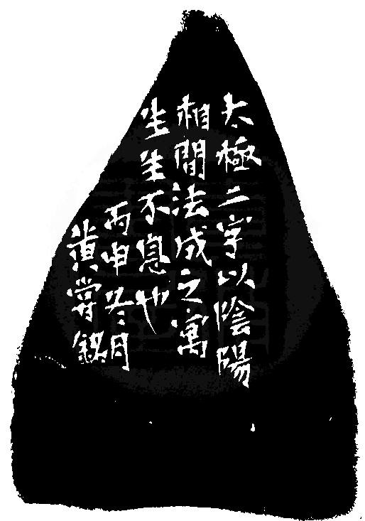 黃嘗銘.六十三歲/為潘昭惠刻〔太極〕自然形朱白文印。邊款為【太極二字以陰陽相間法成之,寓生生不息也,丙申冬月,黃嘗銘。】昌化雞血石。自然頂。