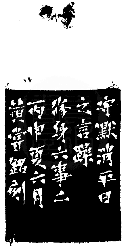 黃嘗銘.六十三歲/刻〔守默消言躁〕正方細朱文印。邊款為【守默消平日之言躁。修身六事二。丙申夏六月,黃嘗銘刻。】老撾石。獸鈕。