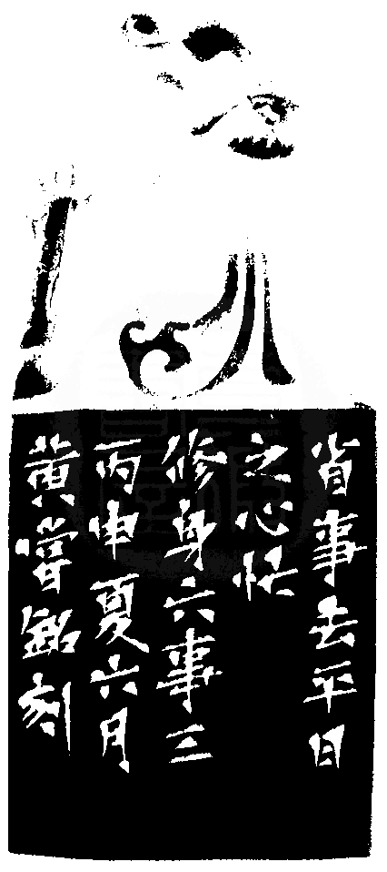 黃嘗銘.六十三歲/刻〔省事去心忙〕正方朱文印。邊款為【省事去平日之心忙。修身六事三。丙申夏六月,黃嘗銘刻。】老撾石。獸鈕。
