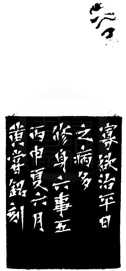 黃嘗銘.六十三歲/刻〔寡欲治病多〕正方白文縱格印。邊款為【寡欲治平日之病多。修身六事五。丙申夏六月,黃嘗銘刻。】老撾石。獸鈕。