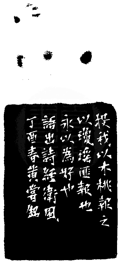 黃嘗銘.六十四歲/刻〔永以為好〕正方朱文印。邊款為【投我以木桃,報之以瓊瑤,匪報也,永以為好也。語出詩經衛風。丁酉春,黃嘗銘。】老撾石。獸鈕。