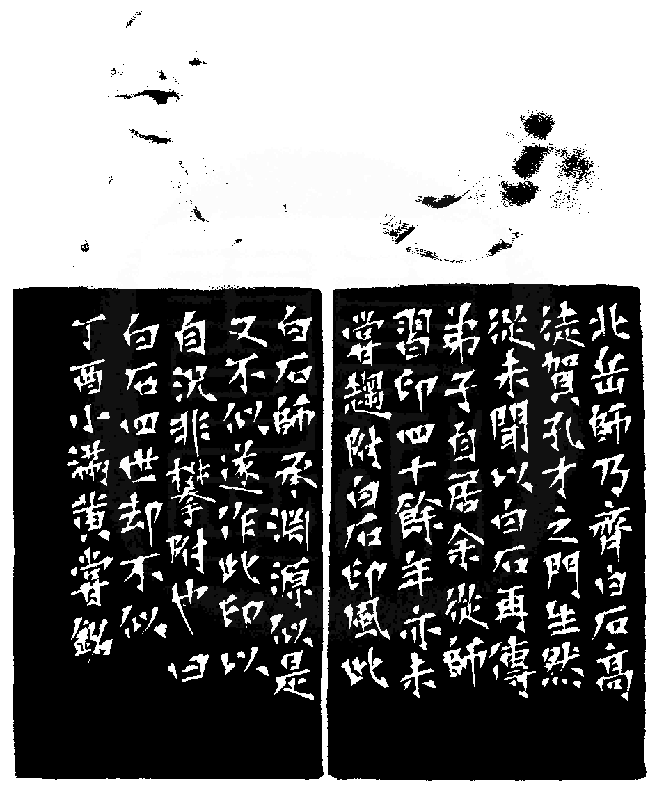 黃嘗銘.六十四歲/刻〔白石四世卻不似〕正方白文印。邊款為【北岳師乃齊白石高徒賀孔才之門生,然從未聞以「白石再傳弟子」自居。余從師習印四十餘年,亦未嘗趨附白石印風。此白石師承淵源似是又不似,遂作此印自況,非攀附也!曰:白石四世卻不似。丁酉小滿,黃嘗銘。】老撾石。獸鈕。