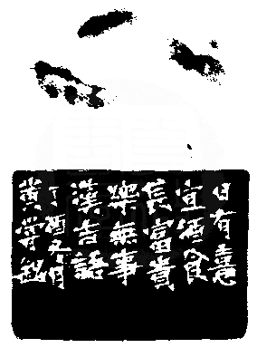 黃嘗銘.六十四歲/刻〔日有◎{上喜下心}〕長方白文印。邊款為【日有◎{上喜下心},宜酒食,長富貴,樂無事。漢吉語。丁酉冬月,黃嘗銘。】老撾黃凍石。螭環鈕。