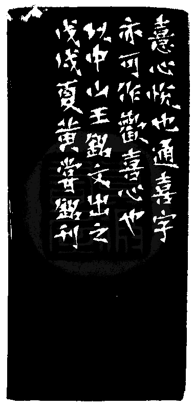 黃嘗銘.六十五歲/刻〔歡◎{上喜下心}〕長方朱文印。邊款為【◎{上喜下心},心悅也。通喜字。亦可作歡喜心也。以中山王銘文出之。戊戌夏,黃嘗銘刊。】老撾石。平頂。