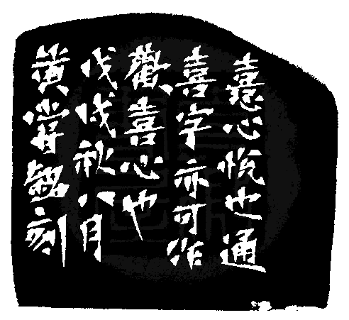 黃嘗銘.六十五歲/刻〔歡◎{上喜下心}〕長方白文印。邊款為【◎{上喜下心},心悅也。通喜字。亦可作歡喜心也。戊戌秋八月,黃嘗銘刻。】老撾石。自然頂。