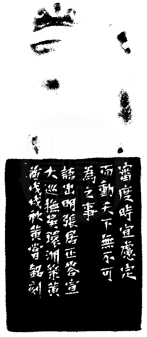黃嘗銘.六十五歲/刻〔審度時宜慮定而動〕正方白文印。邊款為【審度時宜,慮定而動,天下無不可為之事。語出明張居正答宣大巡撫吳環洲策黃酋。戊戌秋,黃嘗銘刻。】老撾石。獸鈕。