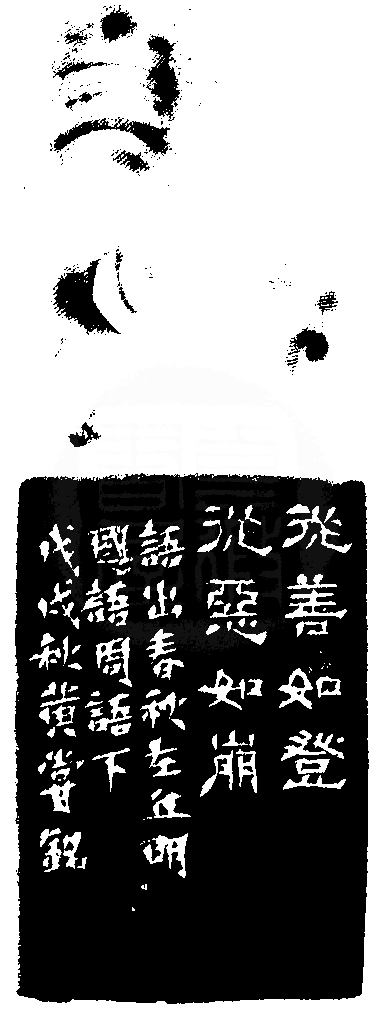 黃嘗銘.六十五歲/刻〔從善如登〕正方朱白文印。邊款為【從善如登,從惡如崩。語出春秋左丘明國語周語下。戊戌秋,黃嘗銘。】老撾石。獸鈕。