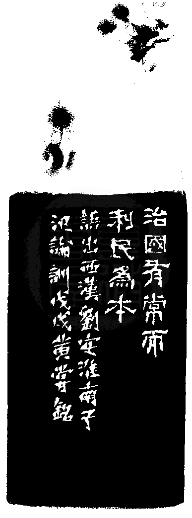 黃嘗銘.六十五歲/刻〔利民為本〕正方白文界格印。邊款為【治國有常而利民為本。語出西漢劉安淮南子氾論訓。戊戌,黃嘗銘。】老撾石。獸鈕。