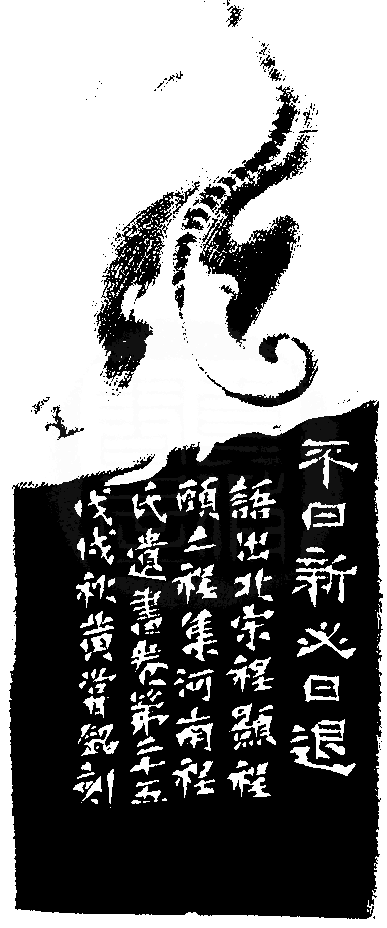 黃嘗銘.六十五歲/刻〔不日新必日退〕正方白文縱格印。邊款為【不日新必日退。語出北宋程顥、程頤《二程集.河南程氏遺書卷》第二十五。戊戌秋,黃嘗銘。】老撾石。螭鈕。