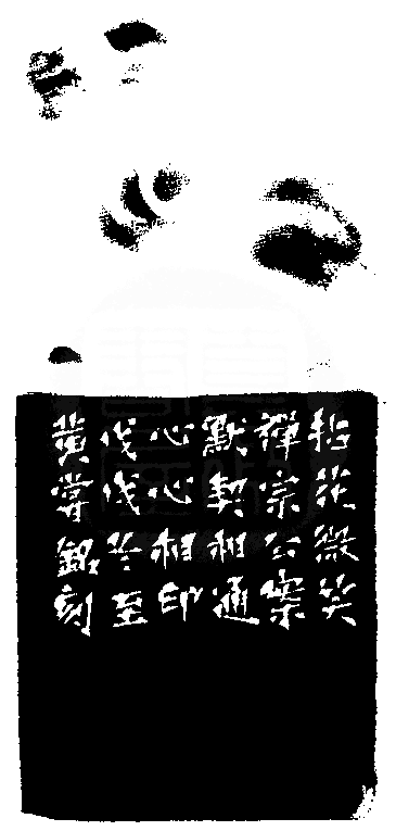 黃嘗銘.六十五歲/刻〔拈花微笑〕長方朱文印。邊款為【拈花微笑,禪宗公案,默契相通,心心相印。戊戌冬至,黃嘗銘刻。】老撾田黃石。獸鈕。