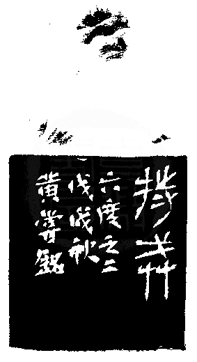 黃嘗銘.六十五歲/刻〔持戒〕正方白文印。邊款為【持戒。六度之二。戊戌秋,黃嘗銘。】老撾田黃石。獸鈕。