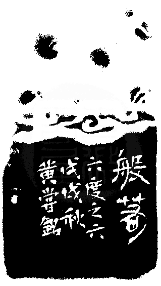 黃嘗銘.六十五歲/刻〔般若〕長方加框白文印。邊款為【般若。六度之六。戊戌秋,黃嘗銘。】老撾田黃石。獸鈕。