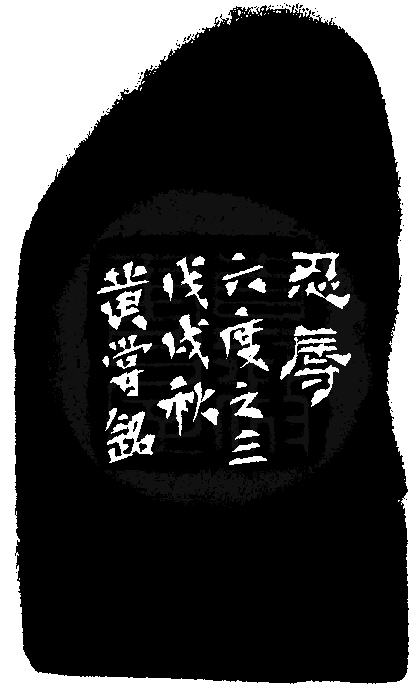 黃嘗銘.六十五歲/刻〔忍辱〕長方朱文印。邊款為【忍辱。六度之三。戊戌秋,黃嘗銘。】老撾石。自然頂。
