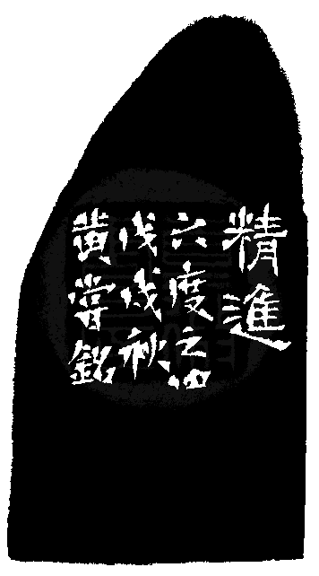 黃嘗銘.六十五歲/刻〔精進〕長方加框白文印。邊款為【精進。六度之四。戊戌秋,黃嘗銘。】老撾石。自然頂。