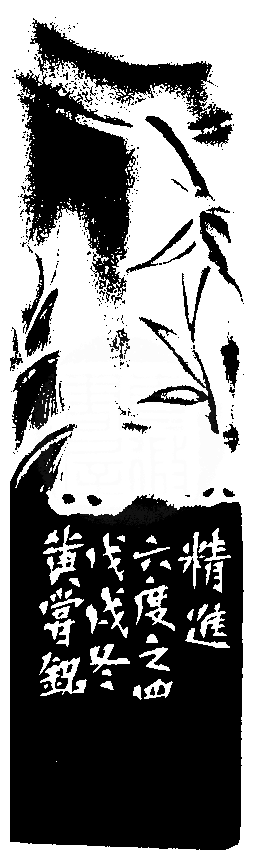 黃嘗銘.六十五歲/刻〔精進〕正方朱文印。邊款為【精進。六度之四。戊戌冬,黃嘗銘。】老撾田黃石。竹節鈕。