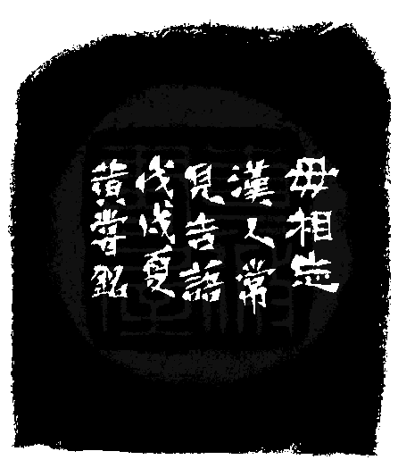 黃嘗銘.六十五歲/刻〔毋相忘〕長橢圓朱文印。邊款為【毋相忘。漢人常見吉語。戊戌夏,黃嘗銘。】老撾石。自然頂。
