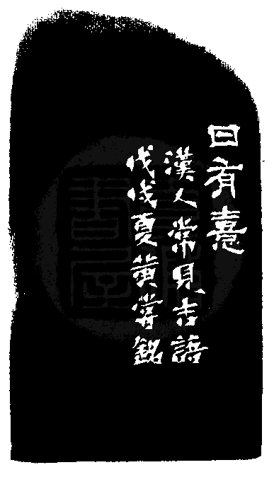 黃嘗銘.六十五歲/刻〔日有◎{上喜下心}〕長方朱文印。邊款為【日有◎{上喜下心}。漢人常見吉語。戊戌夏,黃嘗銘。】老撾石。自然頂。
