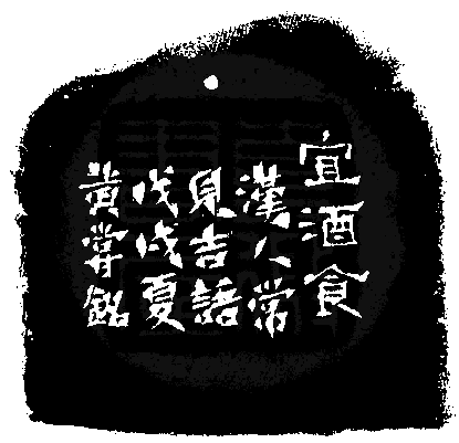 黃嘗銘.六十五歲/刻〔宜酒食〕長橢圓朱文印。邊款為【宜酒食。漢人常見吉語。戊戌夏,黃嘗銘。】老撾石。自然頂。